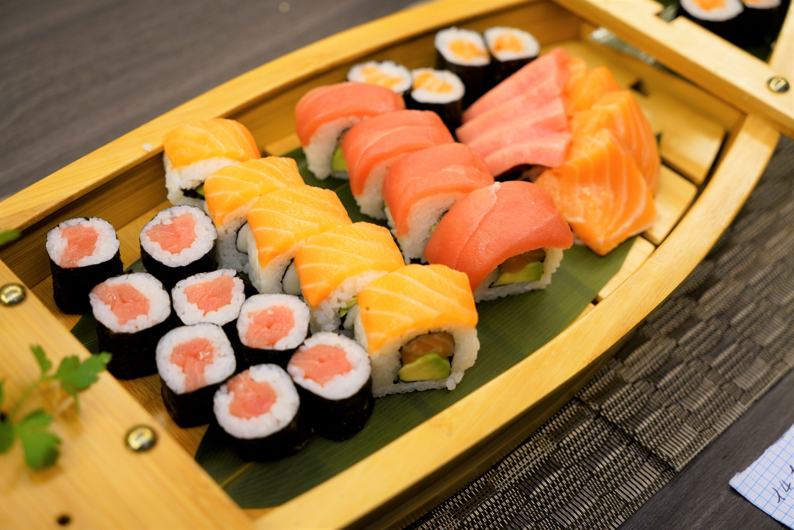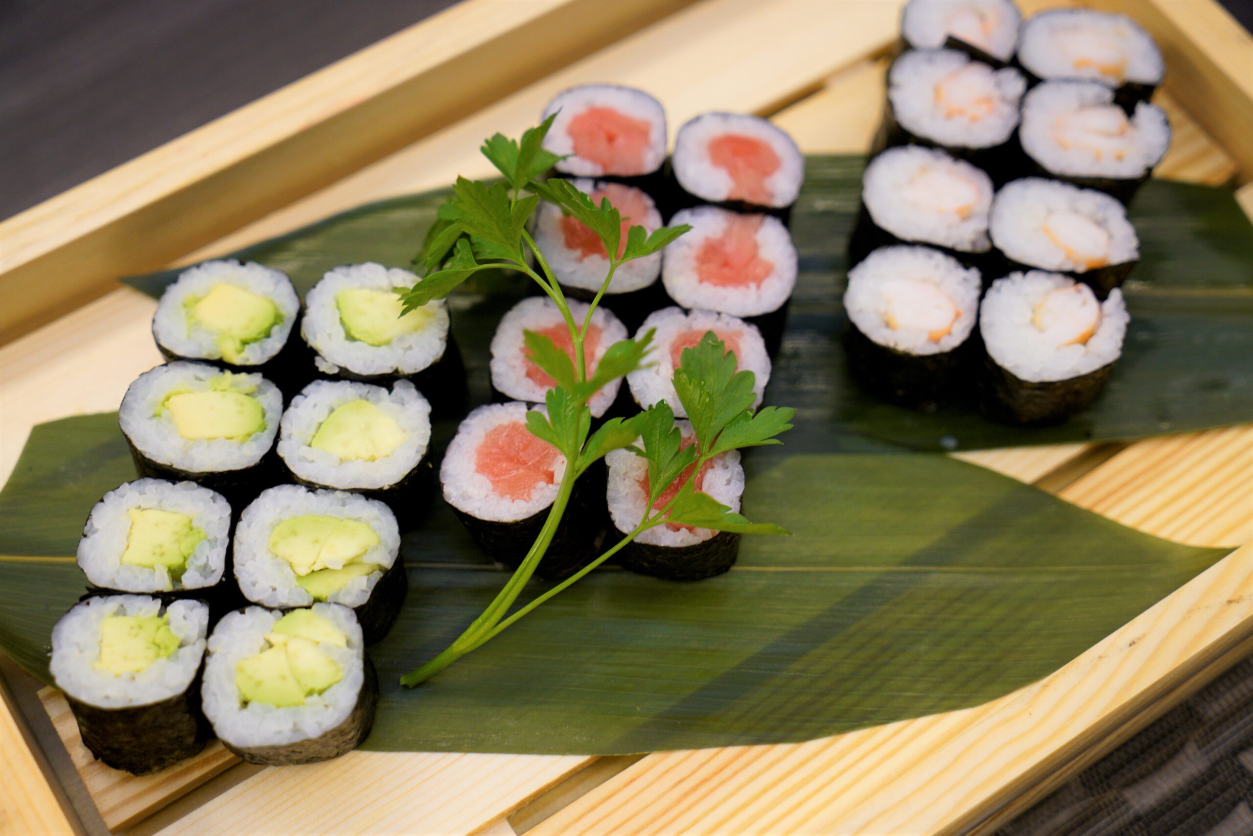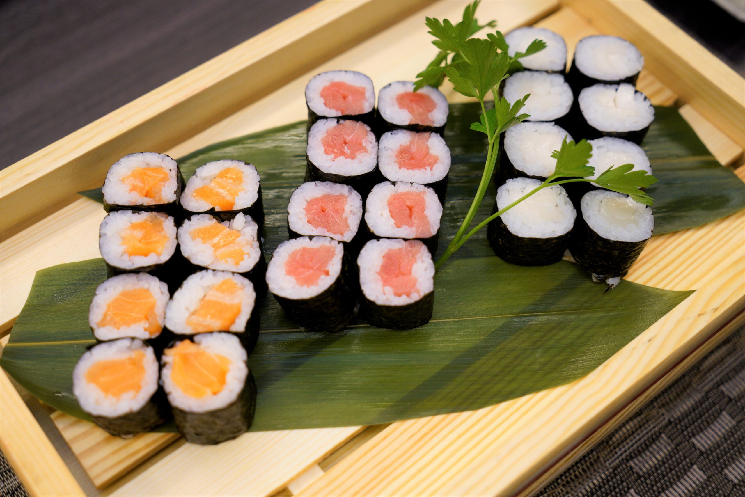 139-Bandeja 1: 2 sushi de salmón, 2 sushi pez mantequilla, 2 sushi atún, 4 maki atún. 4 maki salmón, 4 uramaki salmón con queso, 4 uramaki aguacate, 4 california rollo, 4 sésamo rollo 39.95€